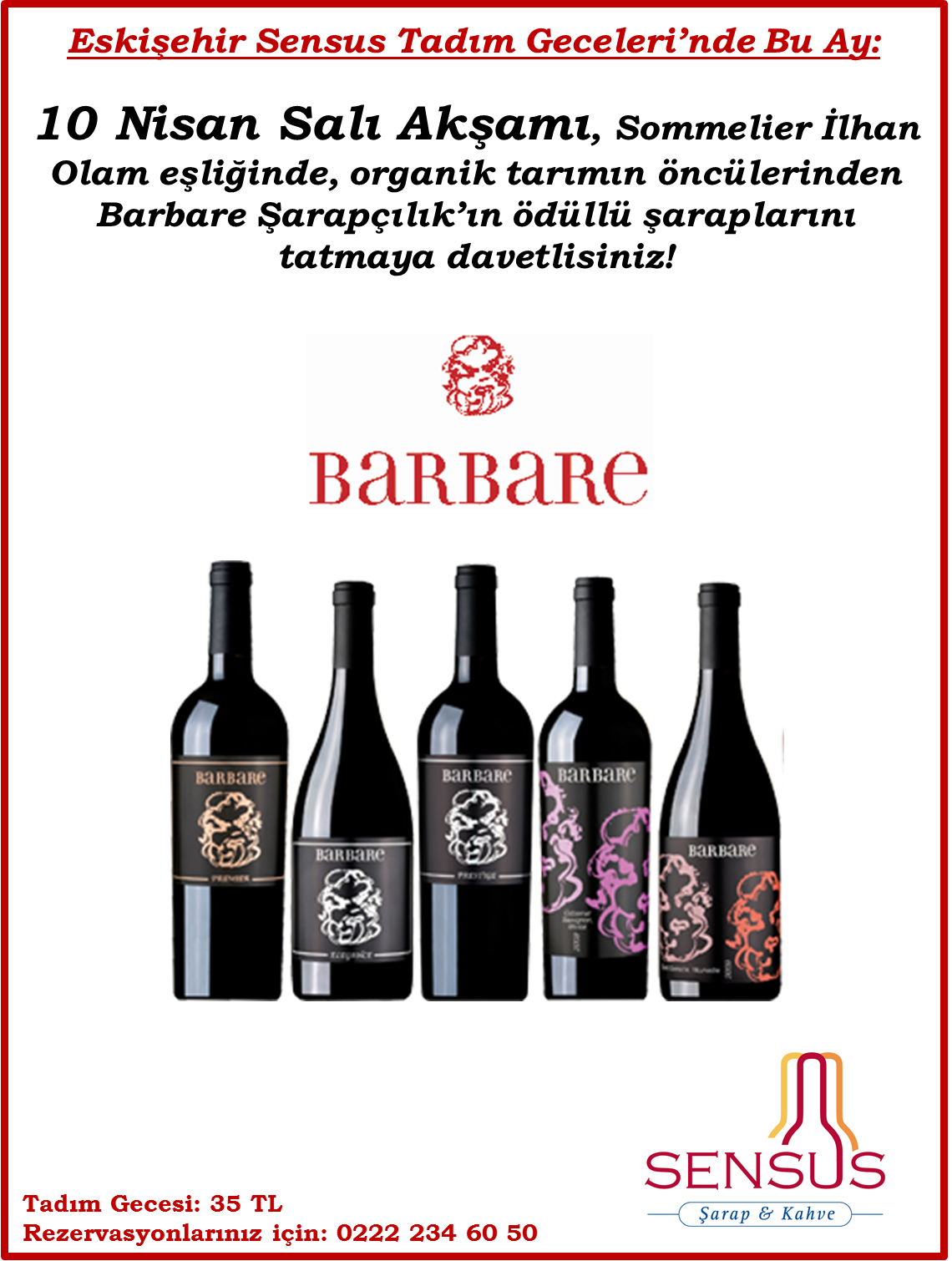 Eskişehir Sensus’ta 10 Nisan’da Barbare Şarapları Tadımı’na Davetlisiniz!